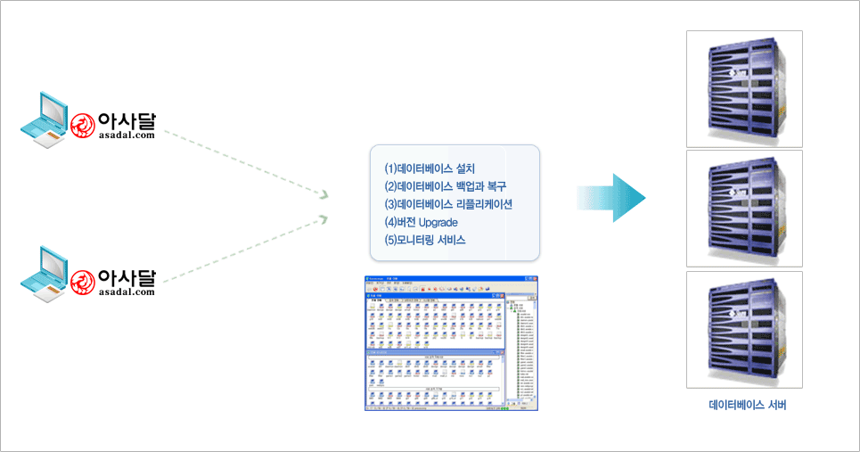 모니터링 서비스: 아사달에서 직접 개발한 서버맨(전문 서버모니터링 프로그램)을 이용하여 서버를 24시간 모니터링하고 장애 시 빠른 복구가 될 수 있도록 지원합니다. |